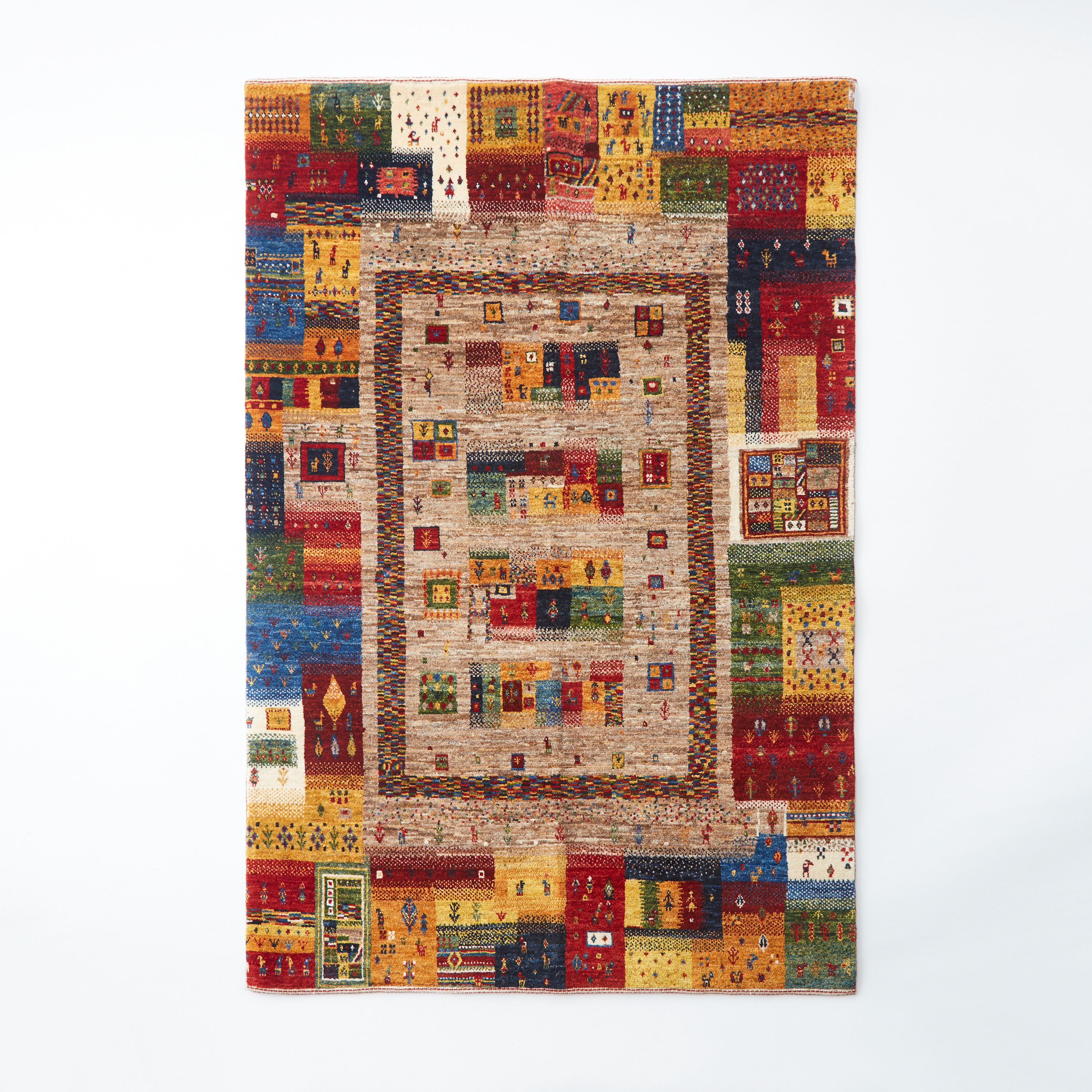 無染色の羊の原毛色を中心に織られており、遊牧民に伝わるモチーフを中心にギャッベの魅力を上質に表現しています。