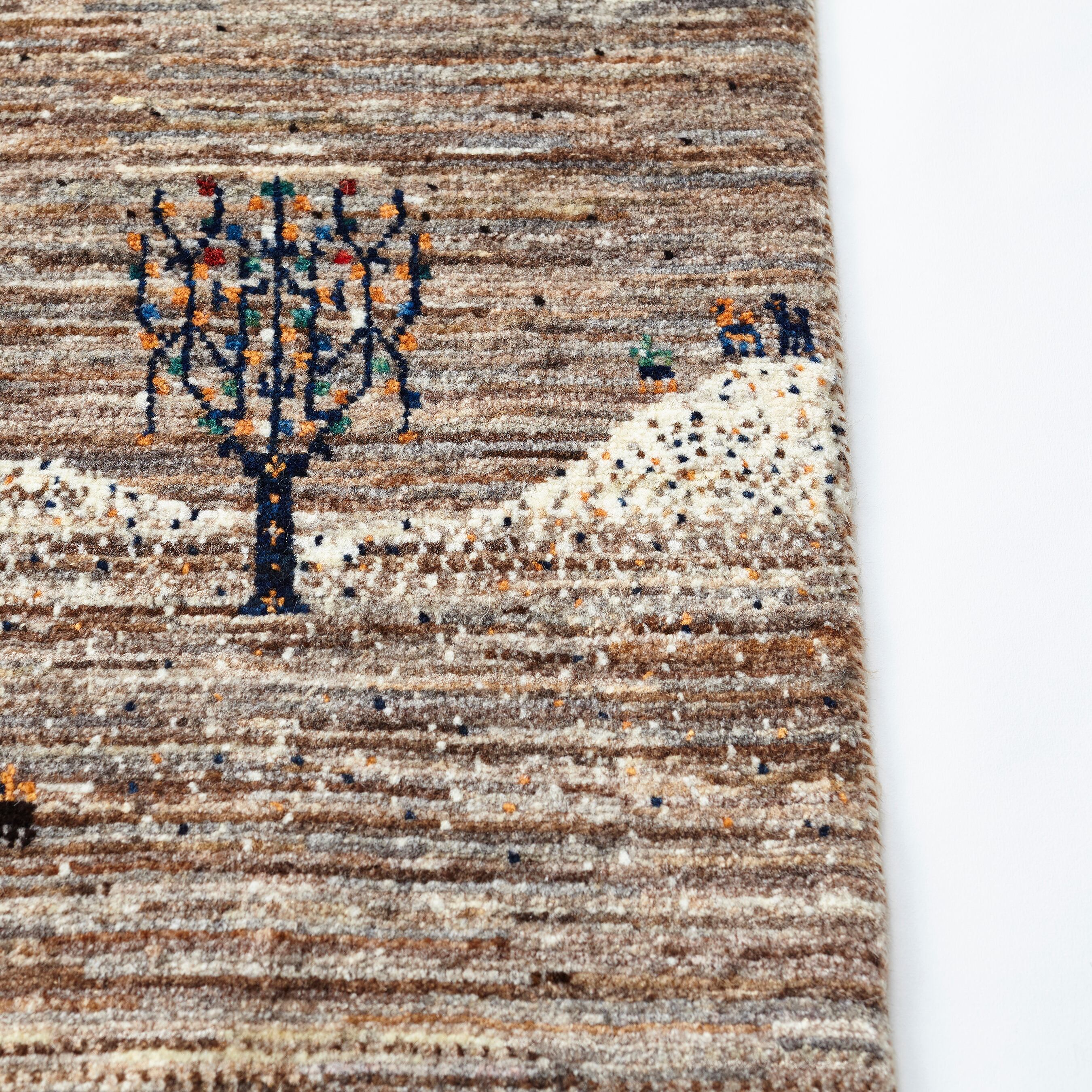 無染色の羊の原毛色を中心に織られており、遊牧民に伝わるモチーフを中心にギャッベの魅力を上質に表現しています。